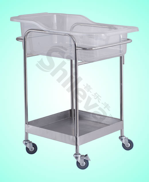 Deluxe Baby TrolleySpecification:680*380*760mm(L*W*H)Description: Made of #304 stainless steel Baby tray is made of ABS plastic, 4” castors.Option: Anti-bacterial leather mattress